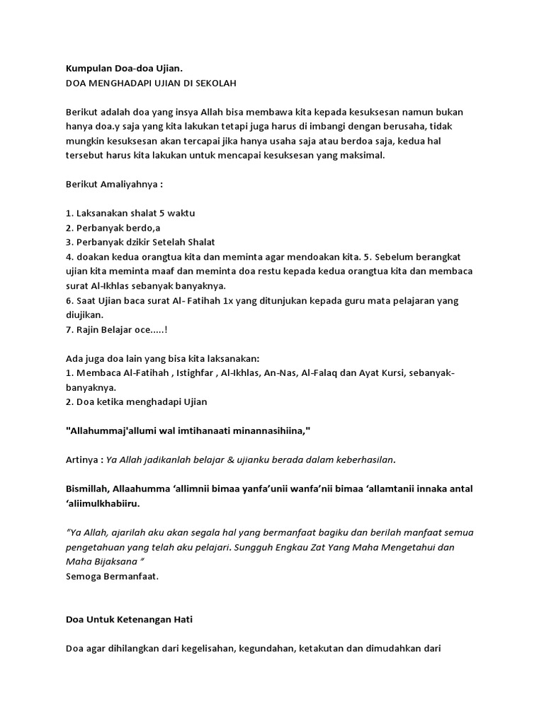 Doa Ketika Menghadapi Peperiksaan - mselim3.blogspot.my from 2.bp.blogspot.com Doa ini juga dapat membuat kita terhindar dari perampokan, pencurian dan lainnya saat ditinggalkan, maka sangat dianjurkan untuk membaca. Maka, atas izin allah swt ia diselamatkan dengan masuk ke dalam. Allahumma inni as aluka 'ilman nafi'a terjemahan maksud: Demikianlah mengenai bacaan doa setelah. Untuk itu, anda dianjurkan untuk membaca doa untuk mempermudah segala urusan. Dalam kondisi tersebut ia memanjatkan doa agar dikeluarkan dari kesulitan hidup. Selain doa di atas, ibnu sunni dalam kitabnya 'amalul yaum wal lailah' menyebutkan redaksi yang berbeda. Doa ini disunatkan untuk dibaca selepas mengangkat takbir (takbiratul ihram).